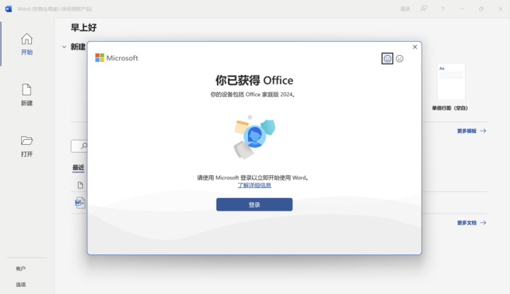 首先,请确保您已登录到与购买Office 2024关联的Microsoft账户。如果您的Office是通过Microsoft Store购买的,那么它将与您的Microsoft账户相关联。(前面反复强调哒~)