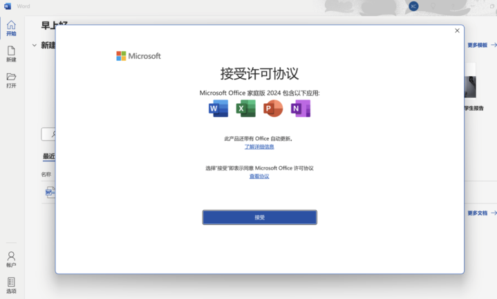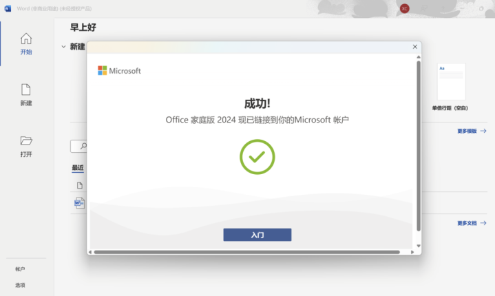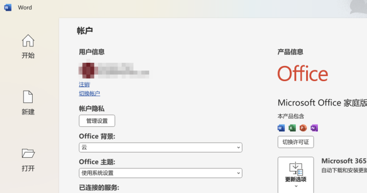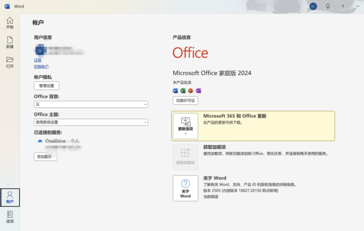 成功激活Office 家庭版2024之后,通过Office应用--文件--点选【帐户】可查看已激活的Office版本信息。