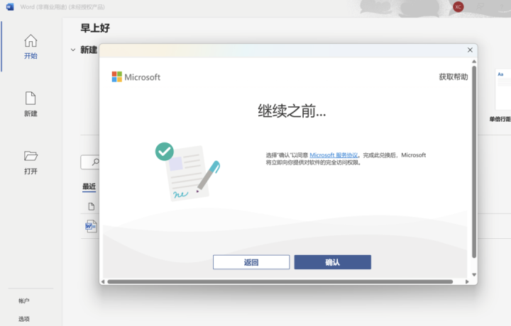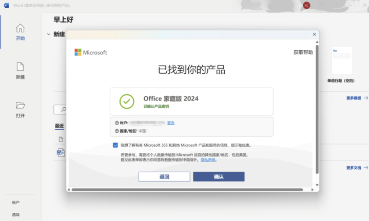 确认将要激活的Office 版本及绑定的Microsoft帐户,请点选【确认】。