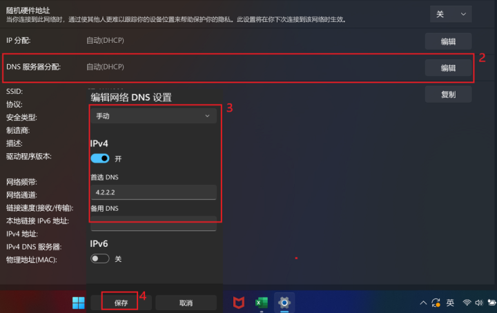 建议更换网络尝试(有时服务器不太稳定),或者将已连接的网络选择属性,DNS服务器分配点选【编辑】,编辑DNS设置选择【手动】,开启IPV4,更改DNS为微软DNS服务器:4.2.2.1,备用4.2.2.2