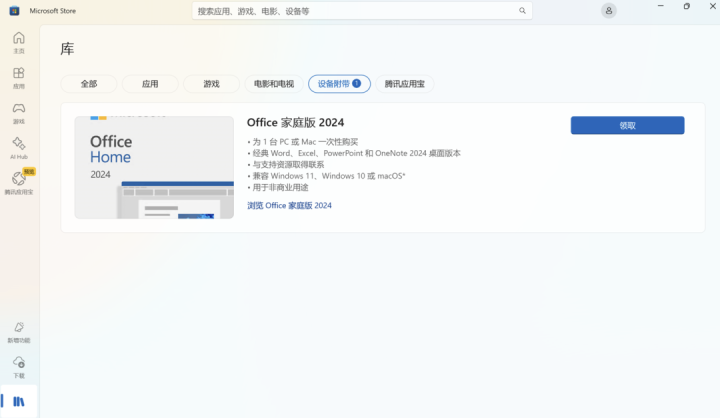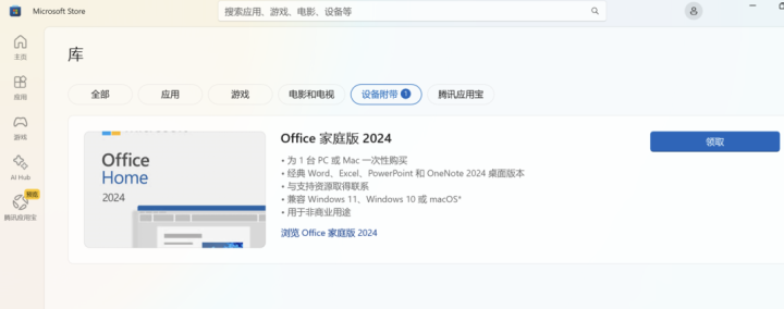 方法②→微软应用商店-库-设备附带显示可领取的Office软件